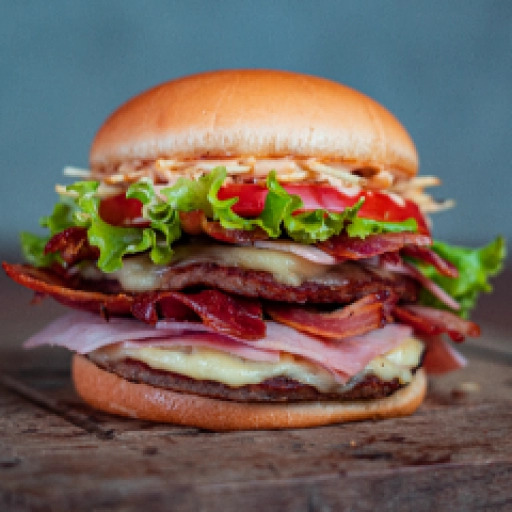 Pão, carne, queijo, presunto, bacon, ovo, salada e batata palha