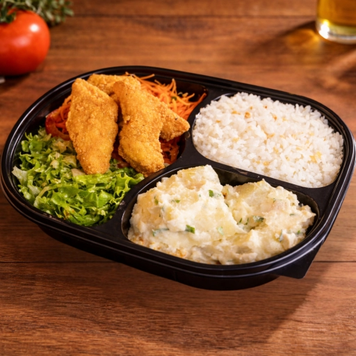 Filé de peixe a milanesa (cação), arroz, feijão, farofa + complemento